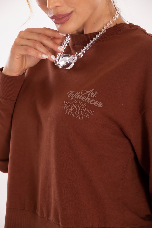 A Blusa de Moletom Tradicional Zita Marrom é confeccionada em moletom leve 100% algodão, garantindo maciez e respirabilidade. A peça possui gola redonda, mangas longas e estampa localizada, ideal para a categoria blusa manda longa. A modelagem foi atualizada para um corte mais curto e quadrado, facilitando combinações com calças retas, joggers ou wide leg em diferentes ocasiões, e exemplificando a atenção da Dezzato à versatilidade no vestir.